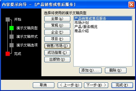 ③ 单击列表框左侧的【销售/市场】按钮,其他保持默认,然后单击【下一步】按钮,打开对话框。