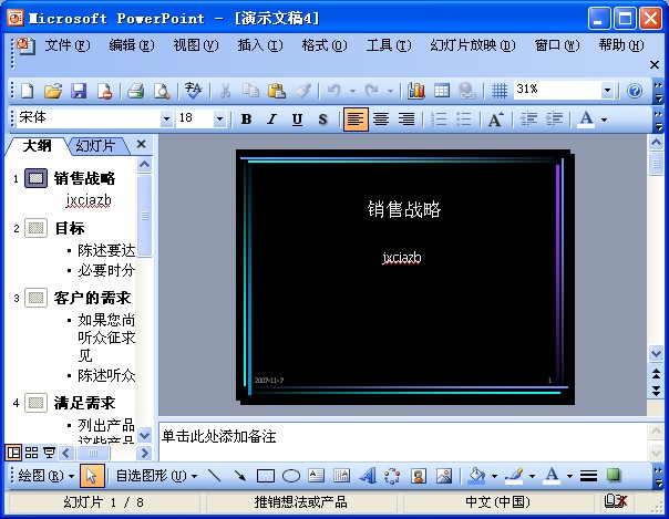 ⑤ 输入演示文稿的标题为“销售战略”,单击【下一步】按钮,打开的对话框。