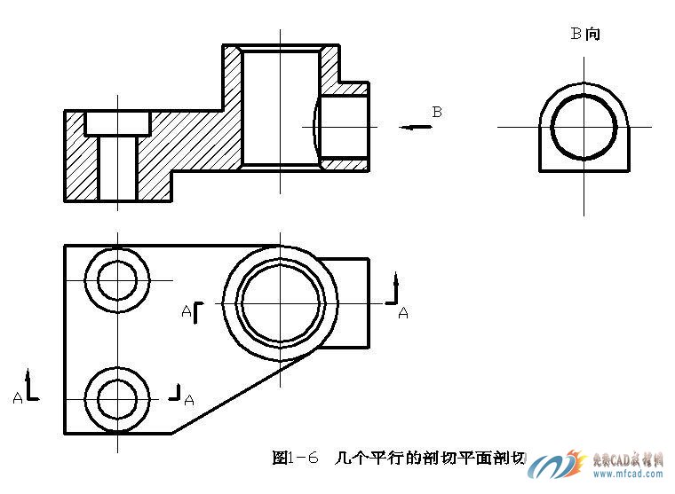 机件上结构不同的孔的轴线分布在相互平行的两个平面内。欲表达这些孔的形状,显然用单一剖切面剖切是不能实现的。此时,可采用一组相互平行的剖切平面一次将它们剖开。