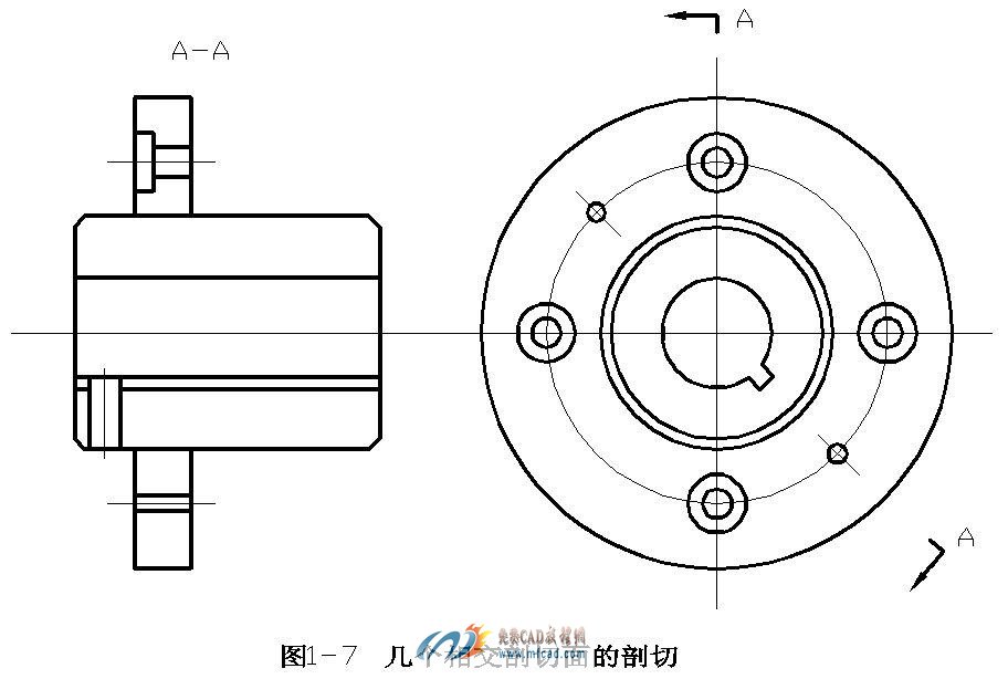 采用两个相交的剖切平面完全地剖开机件。其一通过轴孔和阶梯孔的轴线,它平行于目视平面:其二通过轴孔和小孔的轴线,它倾斜于目视平面。将被剖切面剖开的结构要素及有关部分旋转到与选定的投影面(目视面)平行的位置,然后再向目视平面进行投射,效果如图1-7所示。