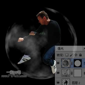 6、把这个球体拖入帅哥文档中,画布扩大一下,图层模式强光,不透明度57%,效果如下。
