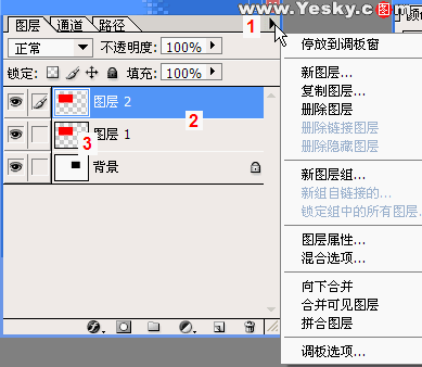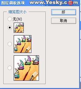 图1中显示出了图层面板最简单的功能,1是图层的菜单功能,点击向右的菜单就可以看到它的功能,包括:新建、复制、删除图层,建立图层组,图层属性,混合选项,图层合并等等功能。2就是图层,3是可以看到图层上图像的缩略图。  在Photoshop中在“窗口”菜单下选择“图层”就可以打开上面的面板,如果想改变图1中3缩略图的大小可以,点击1的三角形按钮展开功能菜单选择“调板选项”打开选择对话框(图2),然后设置缩略图的显示大小了。