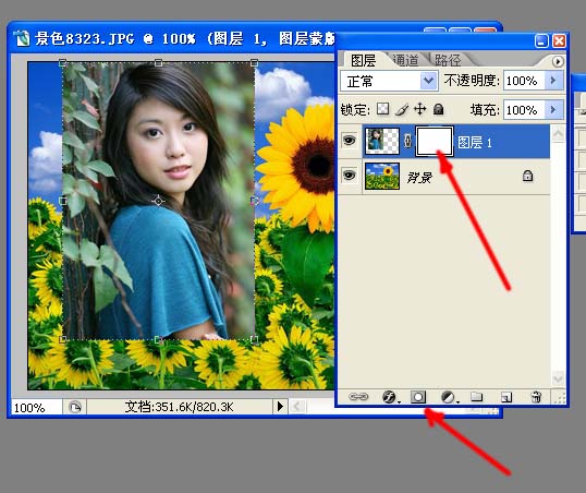 先来认识一下它,先建一个看看:为了看出效果,我们打开一个风景和一个MM,MM在上,风景在下,给MM层添加一个蒙版: |