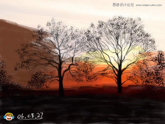 效果图中的色彩相对来说比较少,仅有黄、红、黑色,刻画的时候相对要容易一些。不过树木的树枝和叶子比较难刻画,最好下载一些相关的笔刷。