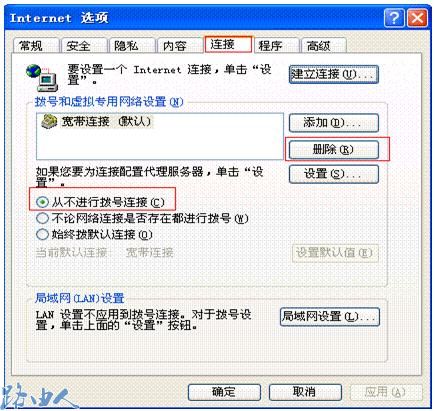 五、点击浏览器里面的工具---Internet选项----连接,如果是拨号上网的用户,请先删除宽带的拨号连接,并选择从不进行拨号连接,如上图所示