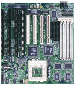AT是最基本的板型,一般应用在586以前的主板上。AT主板的尺寸较大,板上可放置较多元器件和扩充插槽。它是采用直式的设计,键盘插座所处边为上沿,主板的左上方有8个I/O扩充插槽。但是一些外设的接口(如:串口、并行口等)需要用电缆连接后再安装在机箱上,大量的线缆导致计算机内部结构复杂,视线混乱,布局不合理。