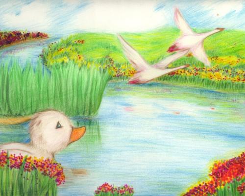 They mounted so high, so very high, and the ugly little duckling became strangely uneasy. He circled around and around in the water like a wheel,craning his neck out into the air after them. Then he uttered the shriek so piercing and so strange that he was quite frightened by himself. Oh, he could not forget those beautiful birds, those happy birds and as soon as they were out of sight. He ducked right down to the bottom and when he came up again, he was quite beside himself. He did not know what the birds were or where’d they flew. But all the same, he was more drawn towards them than he had ever been by any creatures before. He did not envy them in the least. How could it occur to him even to wish to be such a marvelous beauty? He wouldn’t be thankful if only the ducks would have tolerated him among them, the poor ugly creature.