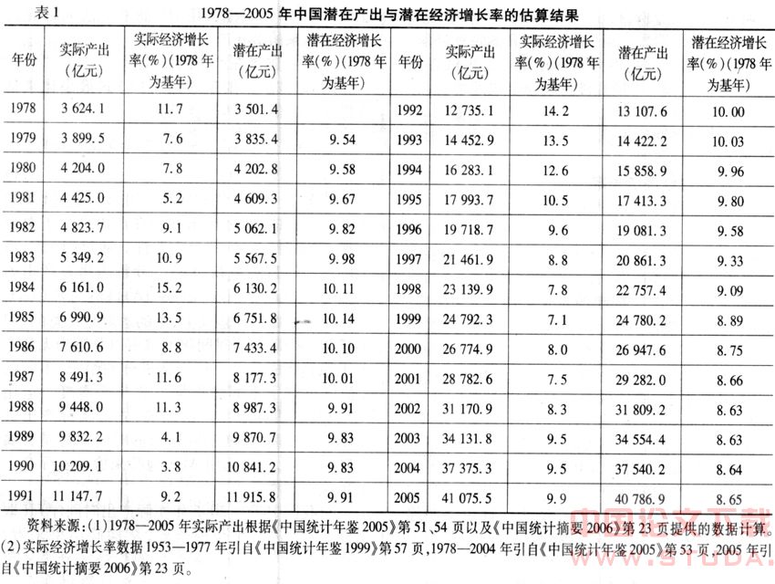 对我国1978-2005年实际产出时间序列(取自然对数)进行单位根检验,从检验结果来看,1978-2005年我国实际产出的趋势成分服从单位根过程。在运用HP滤波方法估算潜在产出时,由于我们使用的是年度数据,取λ=100。由公式(1)就得到了我国1978-2005年潜在产出的值,具体结果见表1,然后进一步计算这期间的潜在经济增长率。
