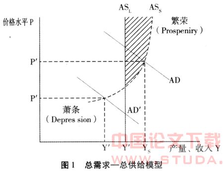 AD-AS模型离不开潜在产出的概念,两者一脉相承。图1中的ASS表示短期总供给曲线,长期总供给曲线ASL与潜在产出线重合。ASL不同于ASS的垂直部分,ASS的垂直部分位于ASL的右边。ASL与ASS的垂直部分和陡峭部分之间的区域,即图中阴影部分,表示繁荣。ASS的完全平坦和相当平坦部分表示萧条。繁荣与萧条之间的过渡阶段是中间区域,表示衰退或复苏。