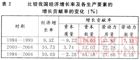 从表1可以看出,对中国经济增长贡献率最高的是资本数量要素,它的平均贡献率为64.58%,远远高于美国的29.77%和日本的 38.07%。但是,如表2所示,我国在1994-1999年资本数量要素对经济增长的平均贡献率为79.05%,而进入21世纪以后该要素对经济增长的平均贡献率已下降到52.02%。