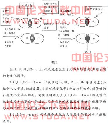 其次,我们还应注意到,对文化的研究不仅仅只是阐释现象,而是学会“深度描述”,用解构的方法从文化符号里剥开一层又一层的含义。同时不仅要研究社会文化中已经出现的新成分(如图二中的C、cl、c2……Cn+1)而且还要注意研究不变的和被抛弃的那一部分(如CnB和CnA)。因为它们不仅塑造着人的外形,也影响着了人的心灵。它们的继续存在或曾经存在过就证明有其存在的价值和意义。所以对它们研究不仅有助于我们了解那个时代社会文化特征,而且对我们挖掘其内部的深层结构、剖析人们的文化心理也有着非常重要的意义。如格尔茨从“巴厘人斗鸡”现象的描述中,探讨了双方的地位、经济和社会身份甚至到巴厘人的性格、气质、心态等方面就是一个很好的范例。