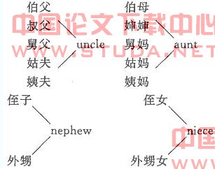 欧美国家的留学生在学习汉语的过程中,每当学到亲属词称谓表达法时都会非常头疼。例如以旁系血亲亲属词语义场为例,可以看到这样的对应: