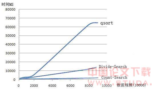 观察分析以上实验结果,可以看出:基于快速排序的查找算法和其他算法相比较具有较差的效率;而采用了分治策略的Divide- Select查找算法的效率可以是基于快速排序的查找算法的几十倍,其时间复杂度在图中也反映为线性。而基于计数排序的查找算法(Count- Search)的时间复杂度同样达到了线性,但是效率却比Divide-Select更高,通过上述实验可以得知:在进行无符号整数查找时,基于计数排序的查找算法(Count-Search)在时间上是最优的。