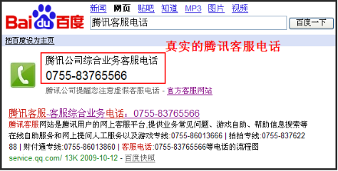 近期腾讯公司收到热心用户反馈的欺诈信息,发现这些案例中都出现了一些虚假的腾讯客服电话。我们根据不法分子惯用的诈骗手段整理了识别网络假冒腾讯客服电话的一些常见方式,请您仔细阅读,以防上当。 辨别方法:腾讯真正的客服电话为 0755-83765566 案例一: 欺诈者留下假冒的客服电话,甚至故意用短线拆分号码,增加迷惑性,比如:最近大量诈骗都利用海南区号0898进行诈骗。 假冒客服热线:089-8880-8XXX-XXXX,行骗者故意拆分号码,其实是:0898(海南区号)-8808XXXX(电话)-XXX (分机) 案例二: 使用网络搜索“腾讯客服电话”、“QQ客服电话”会出现(区号0898或020等)的假冒客服电话,请广大网民提高网络安全意识,注意识别假冒腾讯客服电话。 诈骗分子使用的0898开头的假冒腾讯客服电话: 诈骗分子使用的400开头的假冒腾讯客服电话: 诈骗分子使用的0755开头的假冒腾讯客服电话: 目前有部分用户不知道腾讯公司的客服电话,腾讯官方的建议是:登录腾讯客服网站获得正确的客服电话。 客服电话指引页面:http://service.qq.com/other/phone_flow.shtml 温馨提示: 如果您习惯用网络搜索查找腾讯客服电话,请注意辨别搜索结果的真伪。 您可以通过soso、百度等搜索引擎输入“腾讯客服电话”或“QQ客服电话”即可获得。