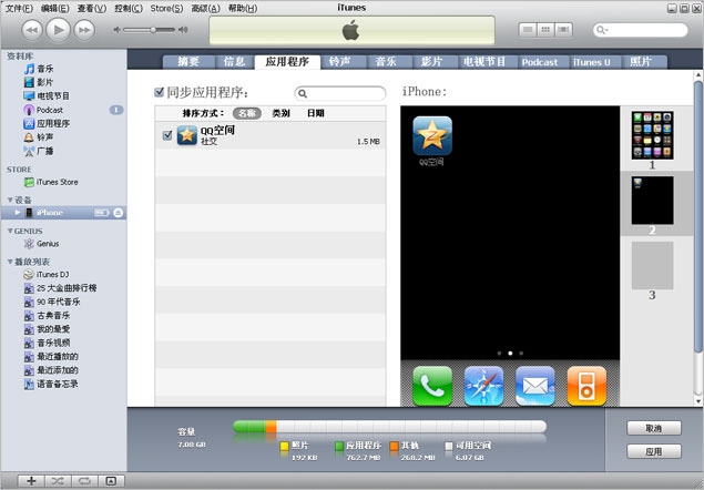 4、完成下载后,打开iPhone同步选项中的应用程序内容,在QQ空间图标前打勾,点击右下"同步"按钮,完成后您的iPhone桌面上就 会出现QQ的启动图标,表明安装成功。如图: